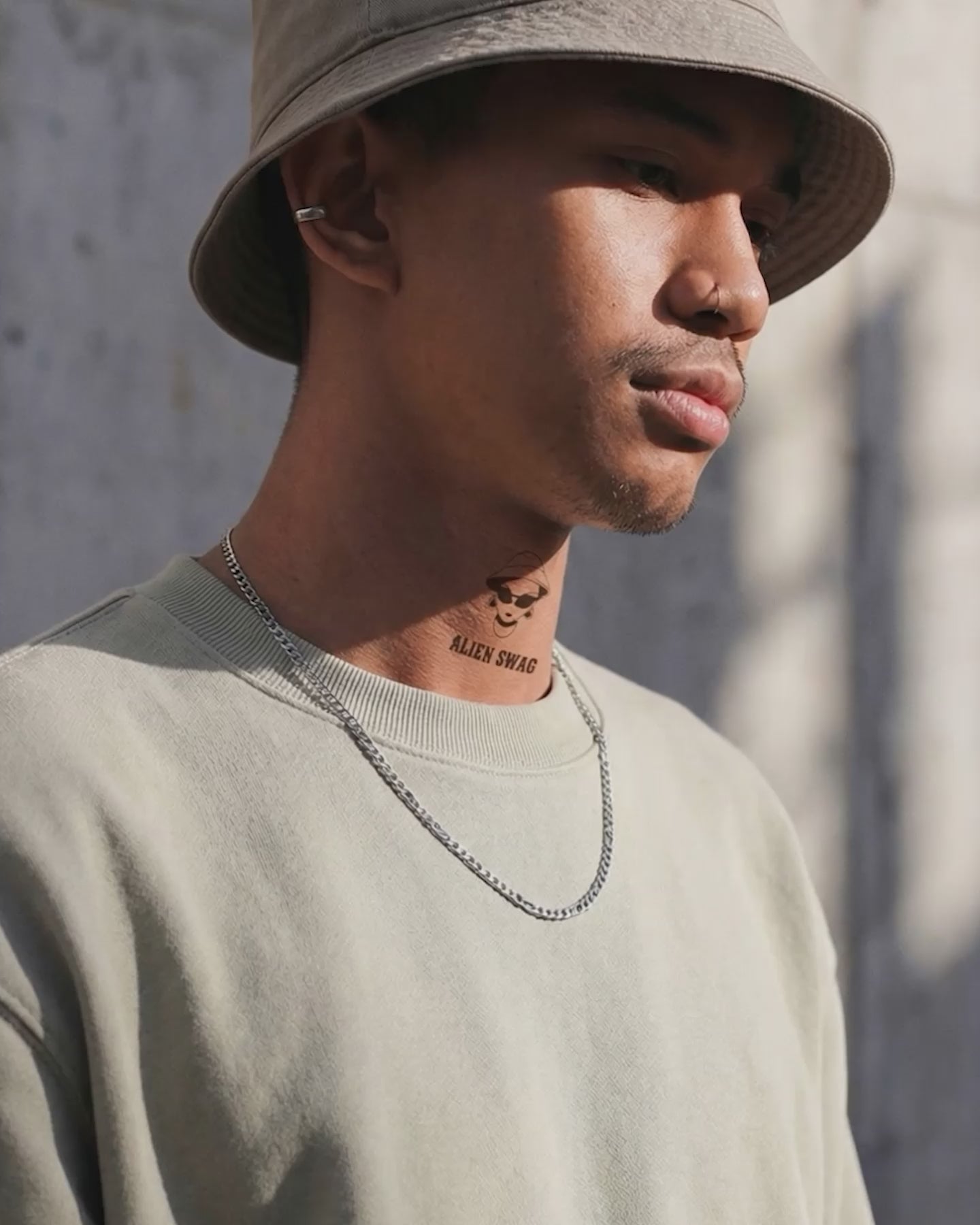Monochrome logo piece—bucket hat, hoops, attitude. Limited and legendary.