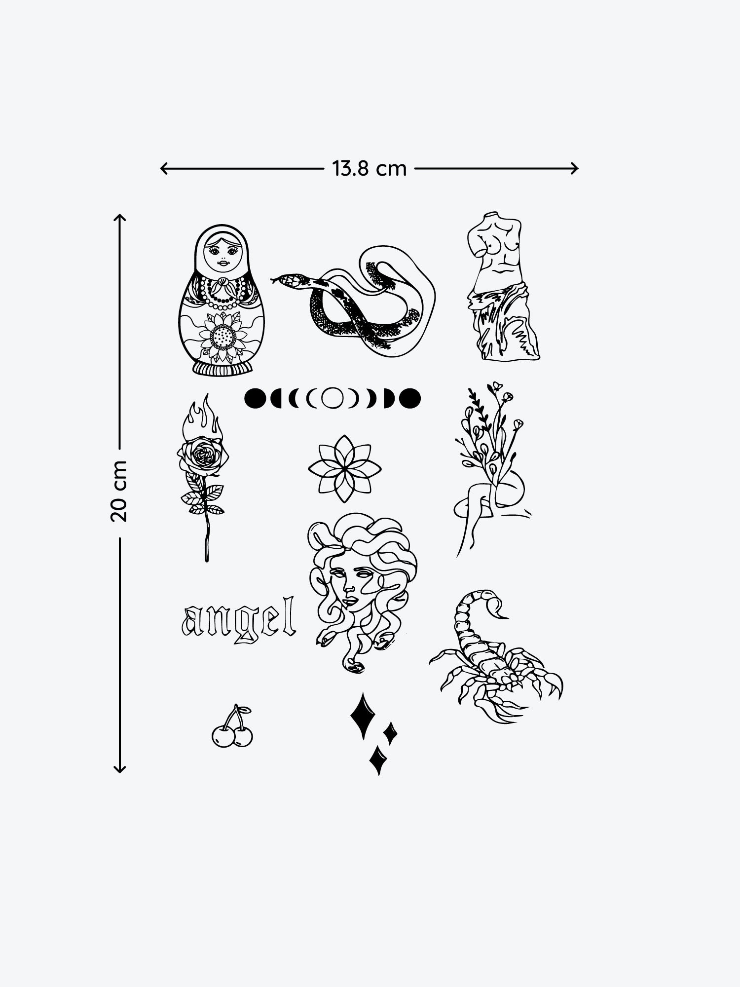 In dieser Range findest du nahezu alle möglichen Größen. Auf jeder Produktseite siehst du in der Bildergalerie der Tattoos die genauen Maße des Tattoos, sodass du genau nachmessen kannst, wie es dir passt. Wir achten dabei sehr auf die Proportionen, um sicherzustellen, dass jedes Tattup-Design sowohl perfekt sitzt als auch einzigartig aussieht.
